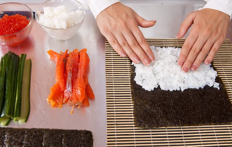 - Set Up Your Rolling Station: Cover the bamboo rolling mat with plastic wrap to prevent the rice from sticking. Have a small bowl of water nearby to keep your fingers moist, which will also prevent the rice from sticking to your hands.