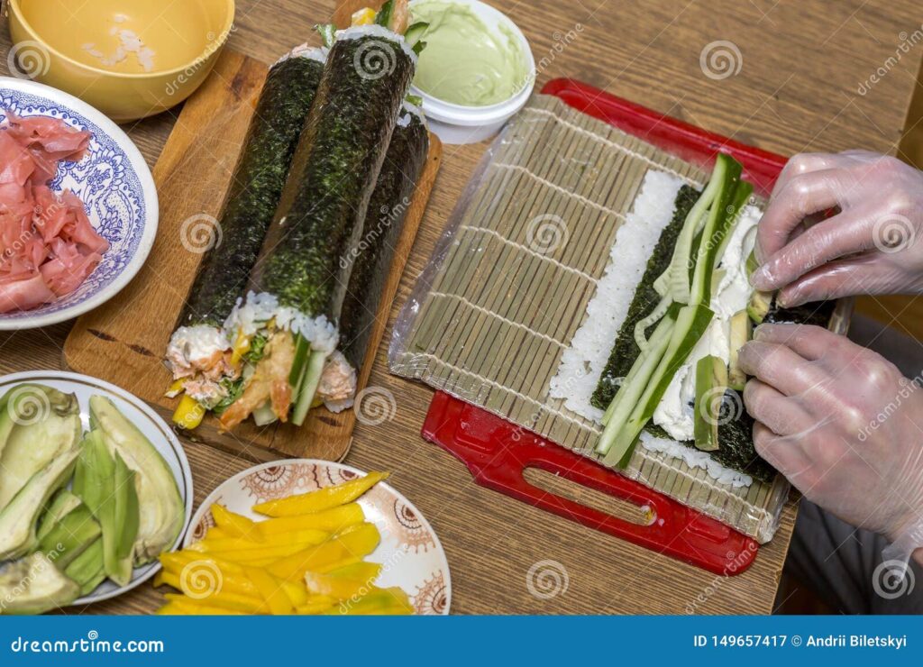 - Roll the Sushi: Lift the edge of the bamboo mat closest to you and carefully roll the nori sheet over the fillings, tucking the edge of the nori under the fillings. Continue rolling tightly, using the bamboo mat to shape the roll. Once the roll is complete, firmly press the bamboo mat around the roll to seal it and give it a uniform shape.