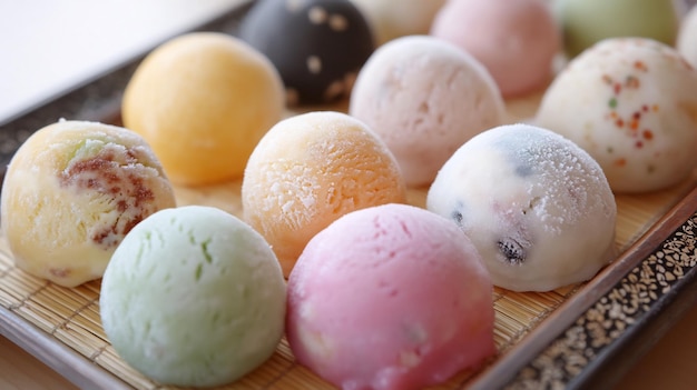 Closeup of Japanese mochi ice cream a variety of flavors served on a